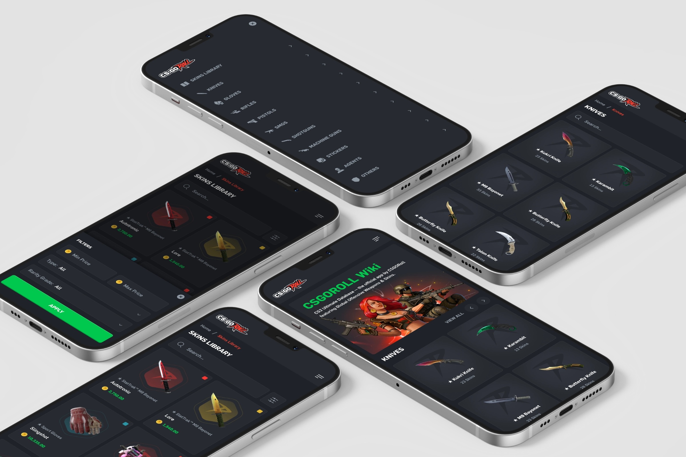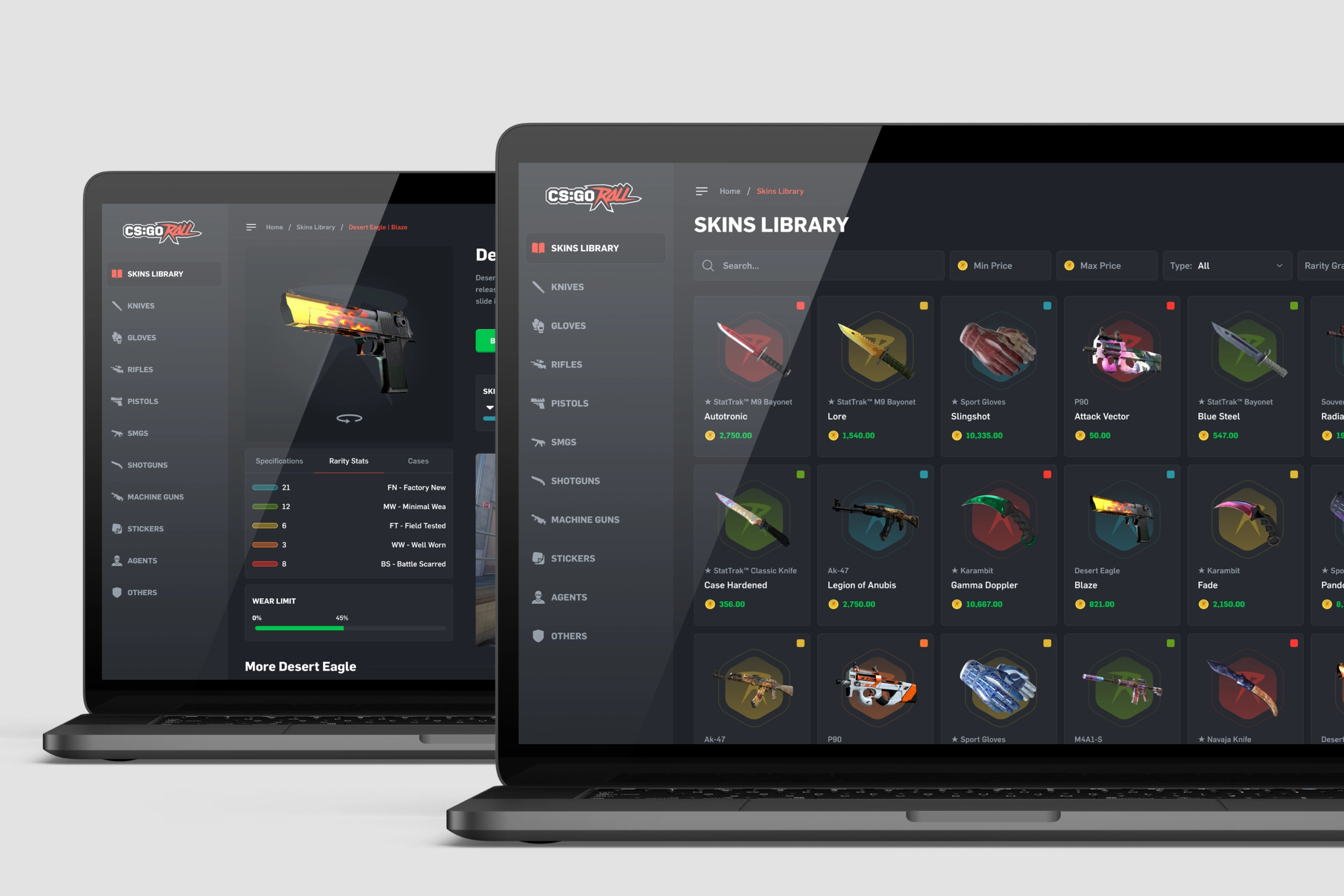 CSGORoll Wiki is the ultimate CS2 database — an official companion app by CSGORoll featuring Global Offensive weapons and skins. The goal was to create an engaging, visually appealing, and easy-to-navigate platform where users can explore all CS2 skins, categorized by weapon type and rarity, with detailed visuals and metadata.