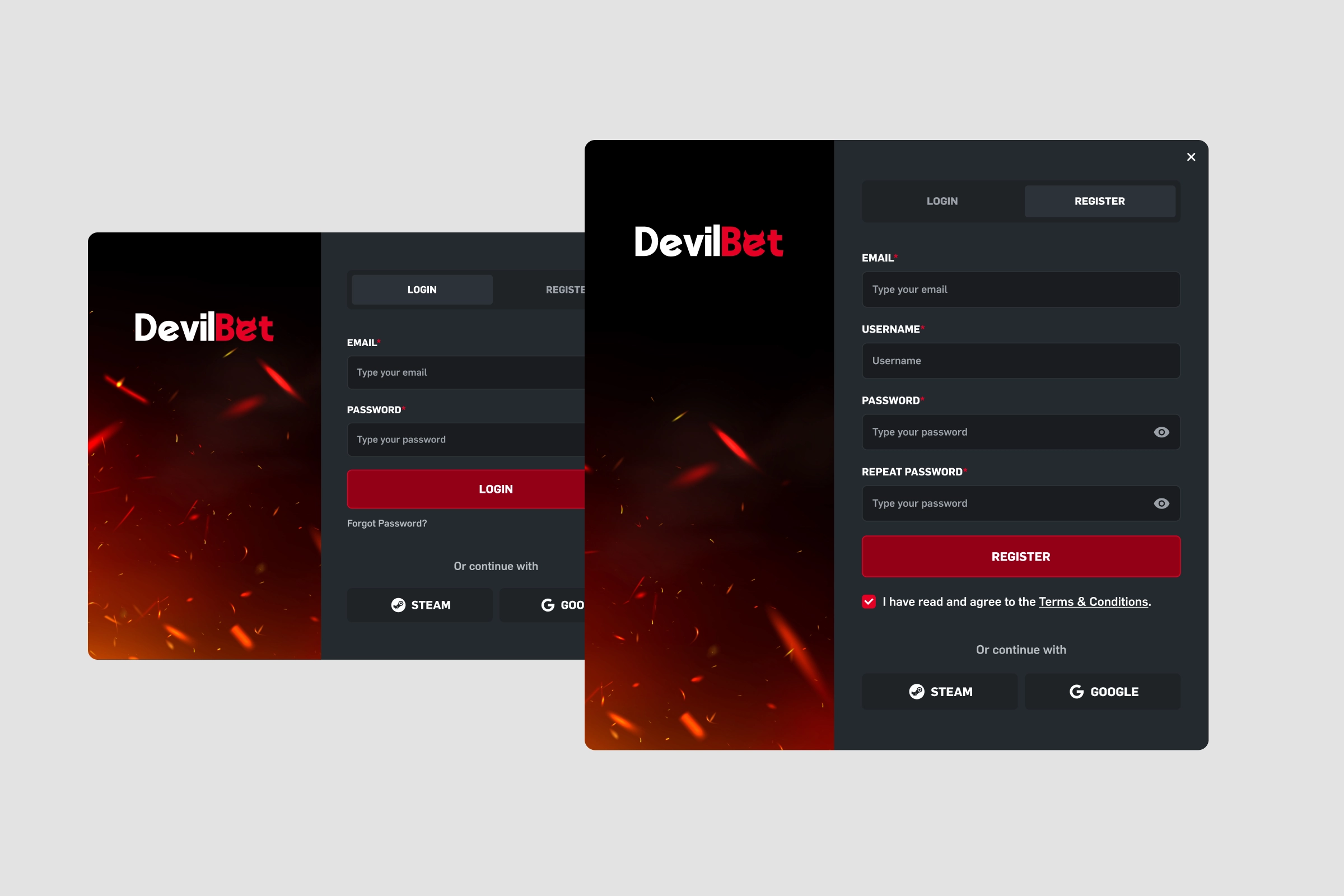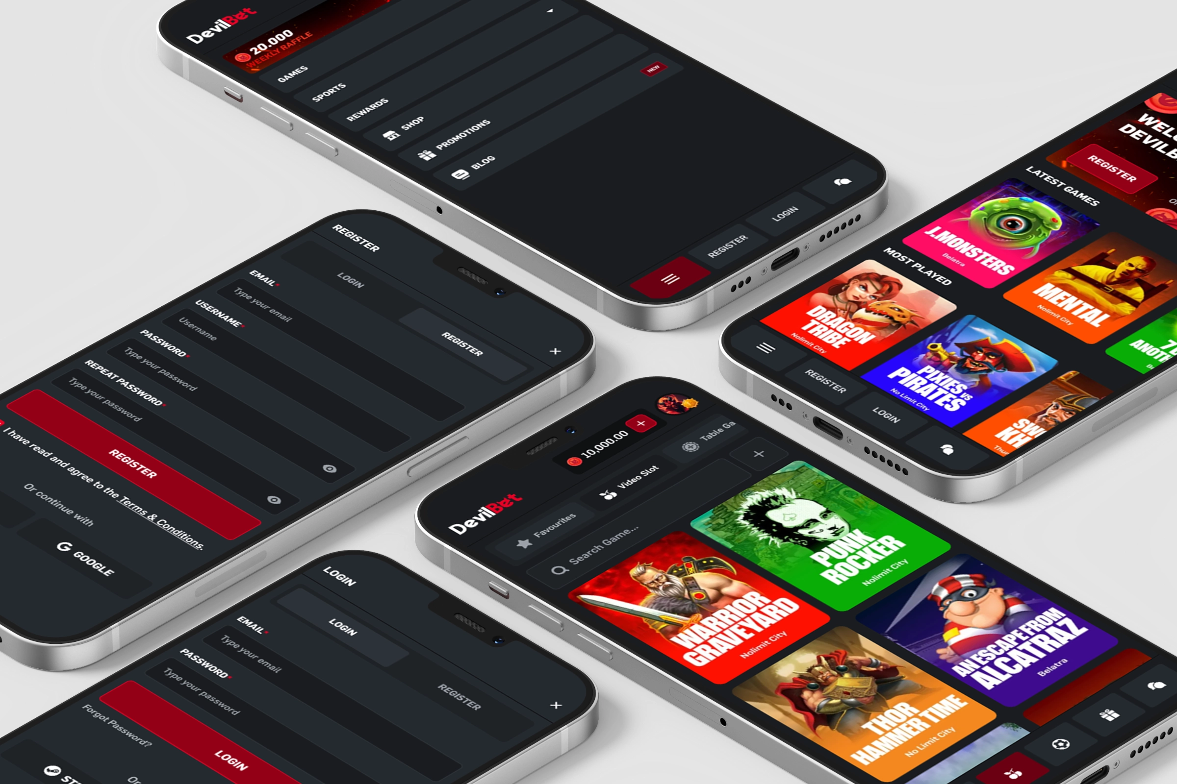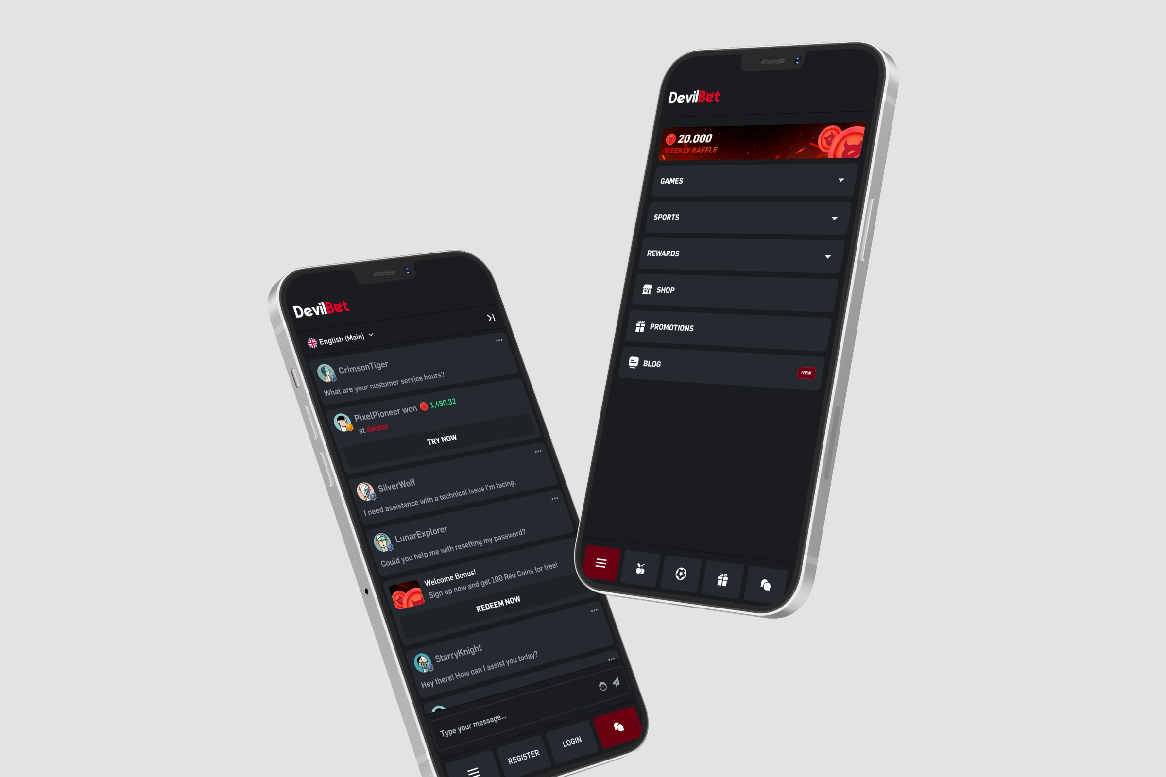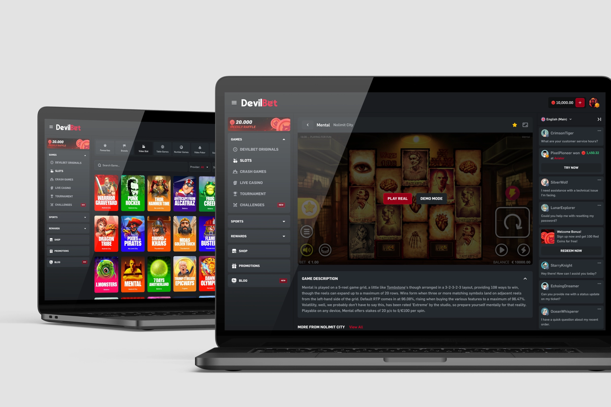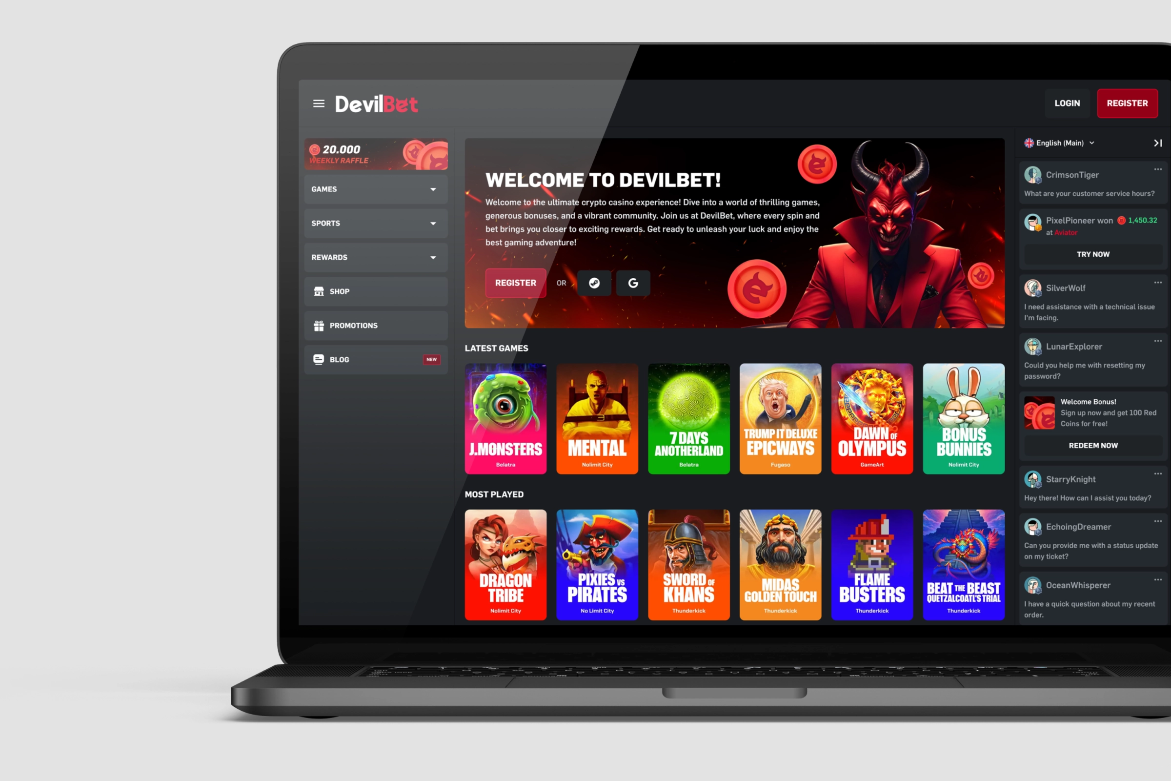 DevilBet is an innovative online gaming platform that combines traditional betting experiences with modern mechanics and a proprietary virtual currency. The interface was designed to be clear and engaging: a sidebar on the left ensures smooth and intuitive navigation, while a live chat on the right keeps users constantly connected. At the core of the project lies the introduction of DevilCoins, a virtual currency that can be used not only for gaming but also to purchase tech items in the dedicated shop and to exchange freely with both traditional currencies and cryptocurrencies.